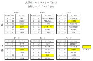 大阪市U-14フレッシュリーグ2025 開催日 2025年9月20日(土) 〜 2026年3月8日(日) 会場 大阪府内各会場 2025年12月3日現在 「後期リーグ ブロック分け」「後期結果」を更新しました。 【エントリー】 ※大阪市地区の中体連・クラブチームがエントリー可能 【ブロック分け】 【試合結果】 レギュレーション
