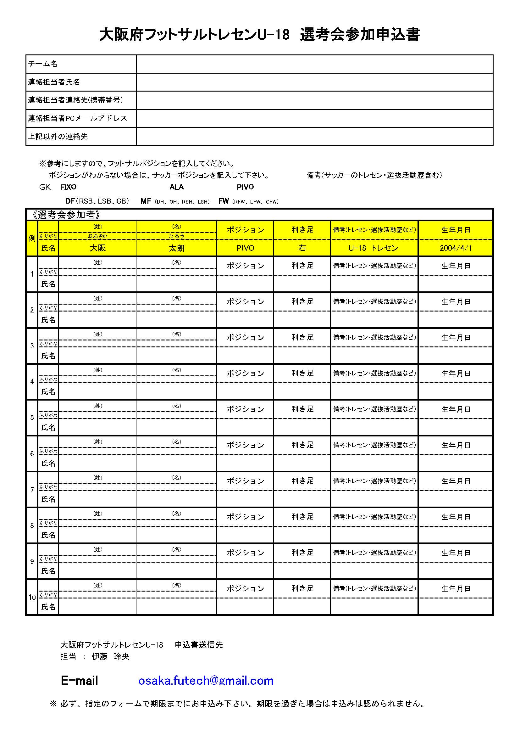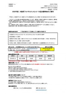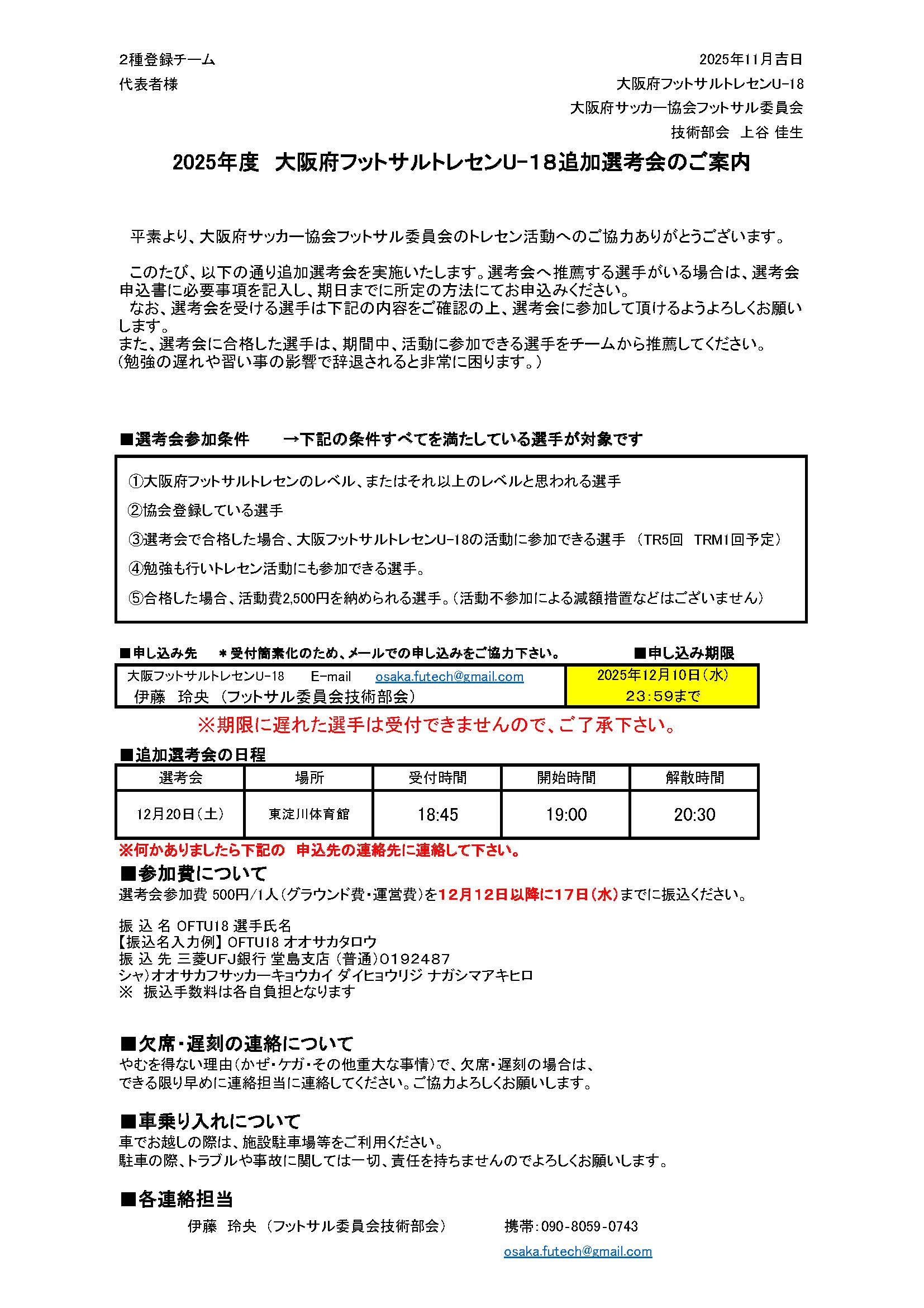 [技術]2025年度大阪府フットサルトレセンU-18選考会 ※追加※ 2025年11月12日(水曜日) 10:26 Event 大阪府サッカー協会 フットサル委員会では、U-18トレセン活動を実施致しますので、ご理解とご協力のほど宜しくお願い致します。(サッカーとフットサルの融合・普及・育成・強化の為に行います。) (PDF / Excel)