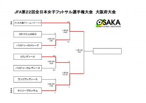 JFA第22回全日本女子フットサル選手権大会 大阪府大会 開催日 2025年10月19日(日) 〜 2025年11月15日(土) 会場 マグフットサルスタジアム、大阪市立千島体育館 11月2日(日)に行われた大会2日目(準決勝)の結果を更新しました。